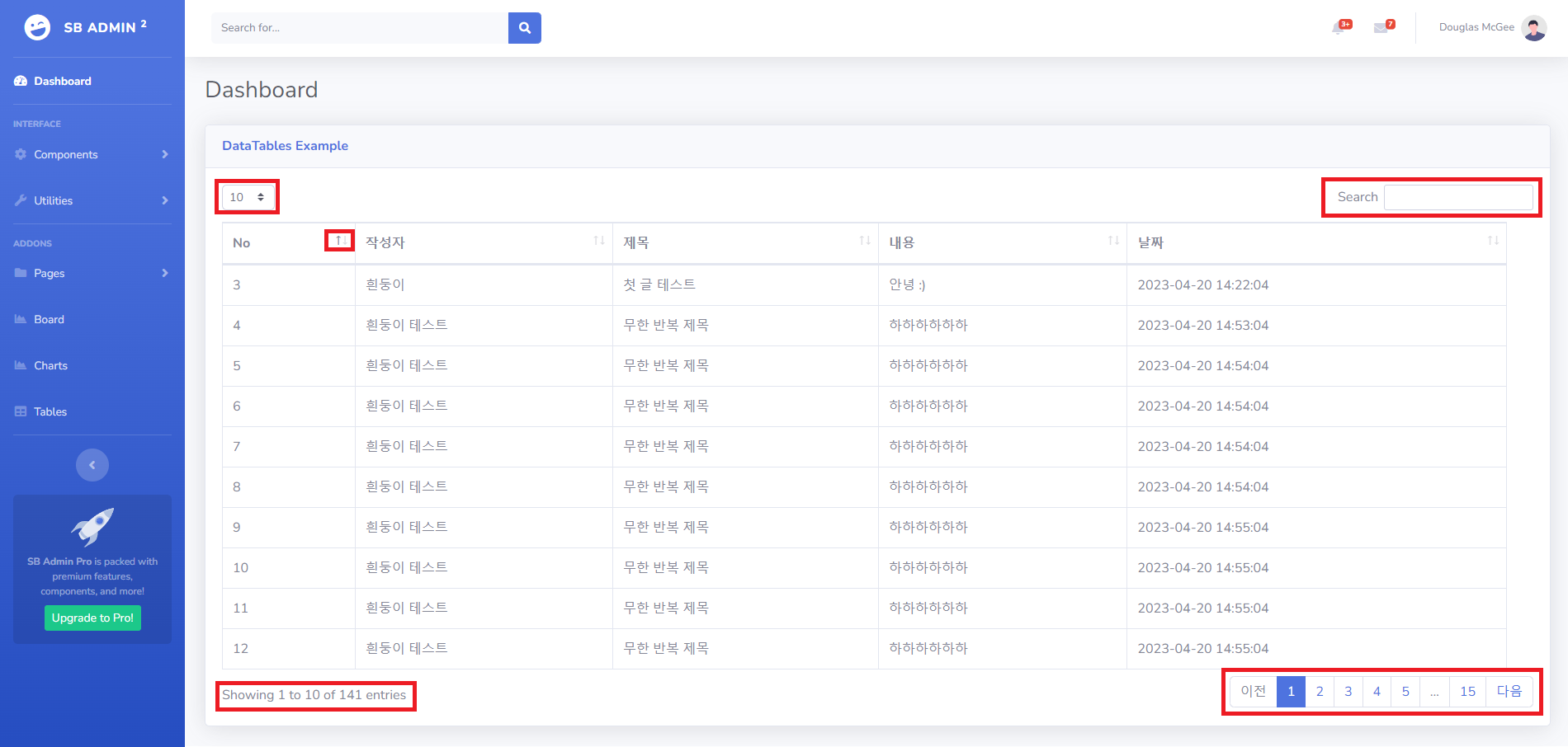 이전글에 이어서 layout을 적용한 Board.html 파일을 만들어 게시판 페이지로 생성하였다